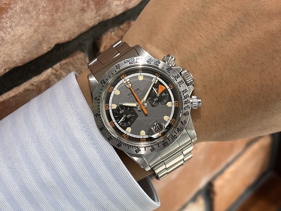 本日はヴィンテージモデルの中から“TUDOR モンテカルロ”(Ref.7032/0)をご紹介。 TUDOR初のクロノグラフモデルで、特徴的なインデックスの形から『ホームプレート』の愛称でも親しまれております。 |