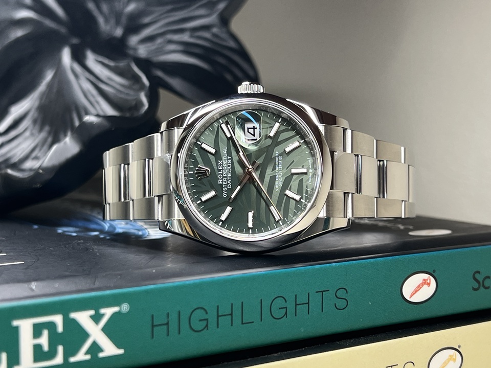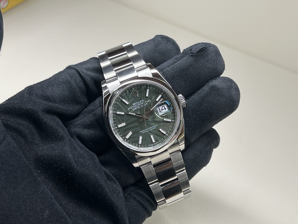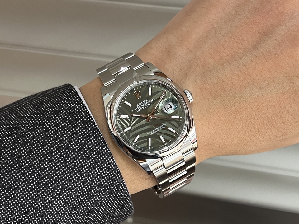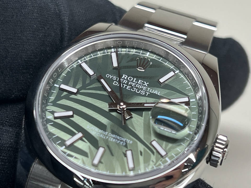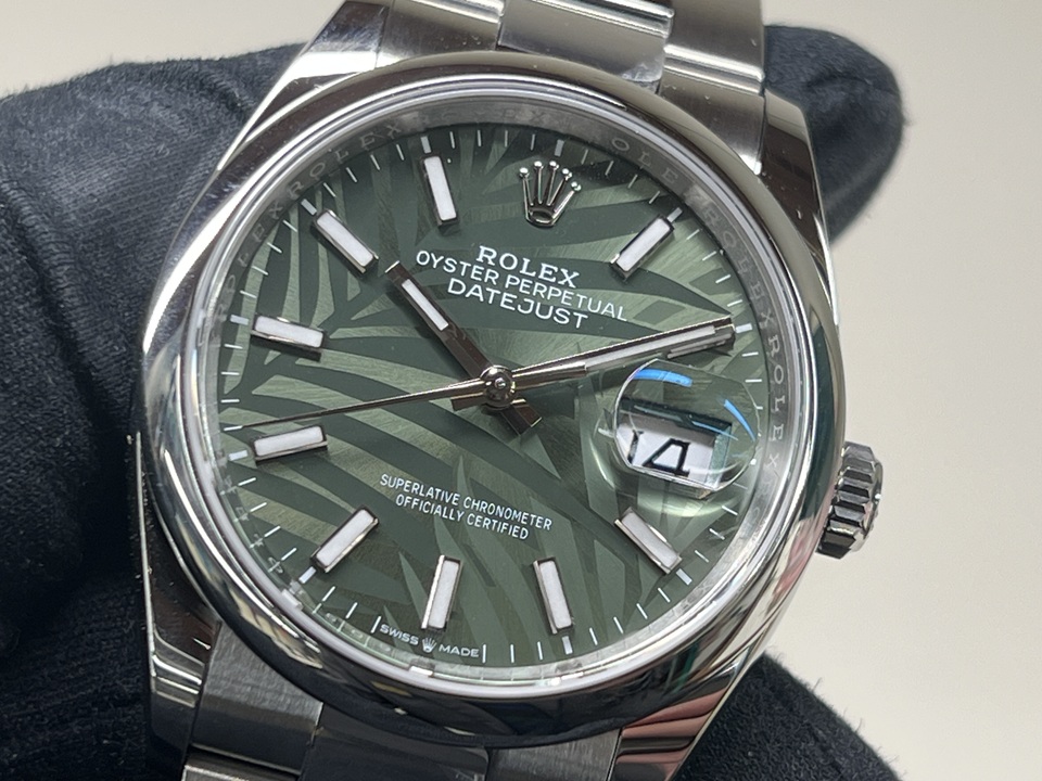 本日は“DATEJUST”(Ref.126200)オリーブグリーンパームモチーフダイヤルをご紹介。36mm径のデイトジャスト『Ref..126200』。様々な組み合わせが存在し、自分好みの1本を選ぶのも楽しいモデルでございます。