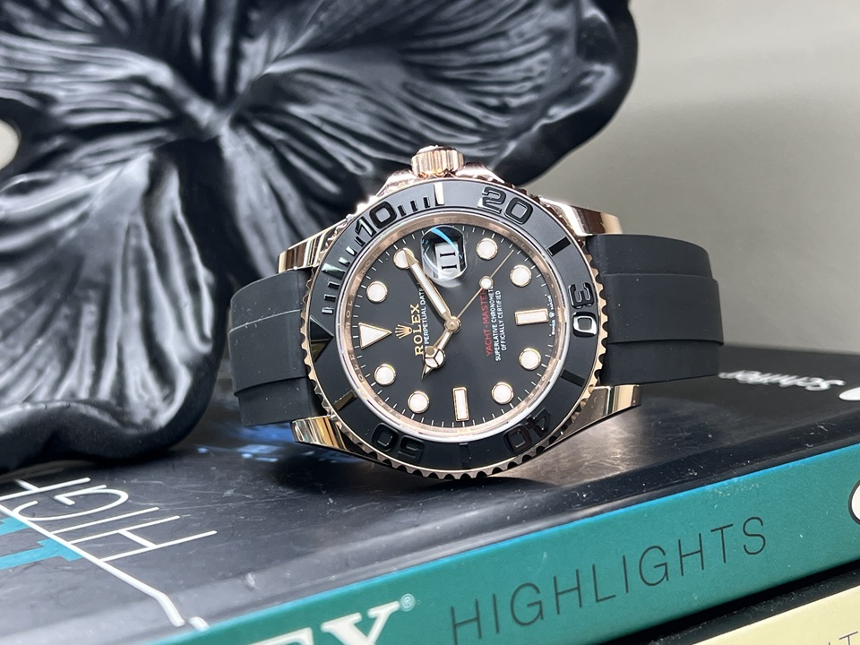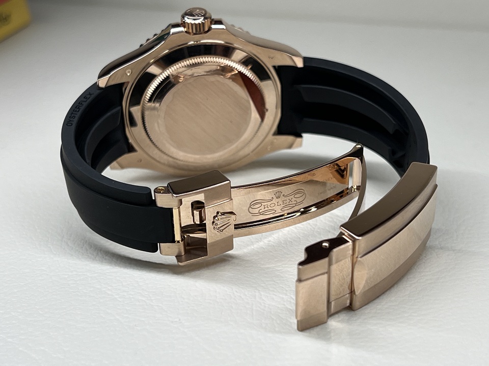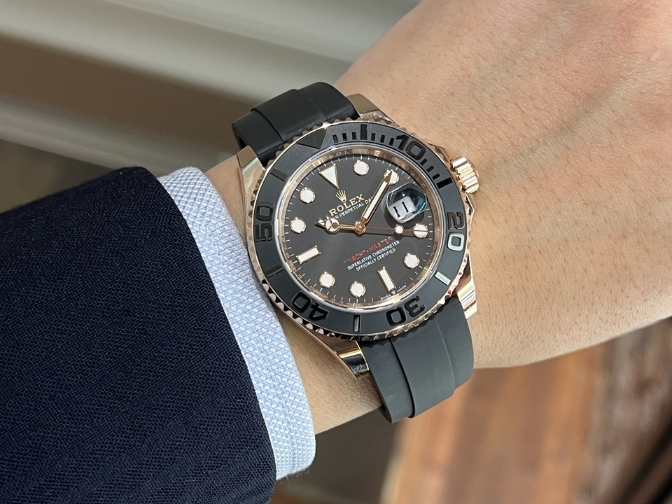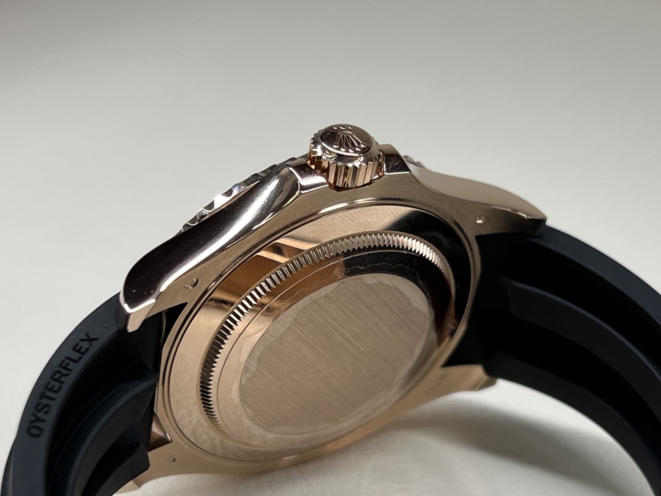| 肌馴染みの良いピンクゴールドに、マットブラックのベゼルインサートは華やかさもありつつ引き締まった印象。金無垢モデル特有の重量感と、スポーティーなラバーブレスで非日常的な雰囲気をお楽しみいただける1本でございます。 |