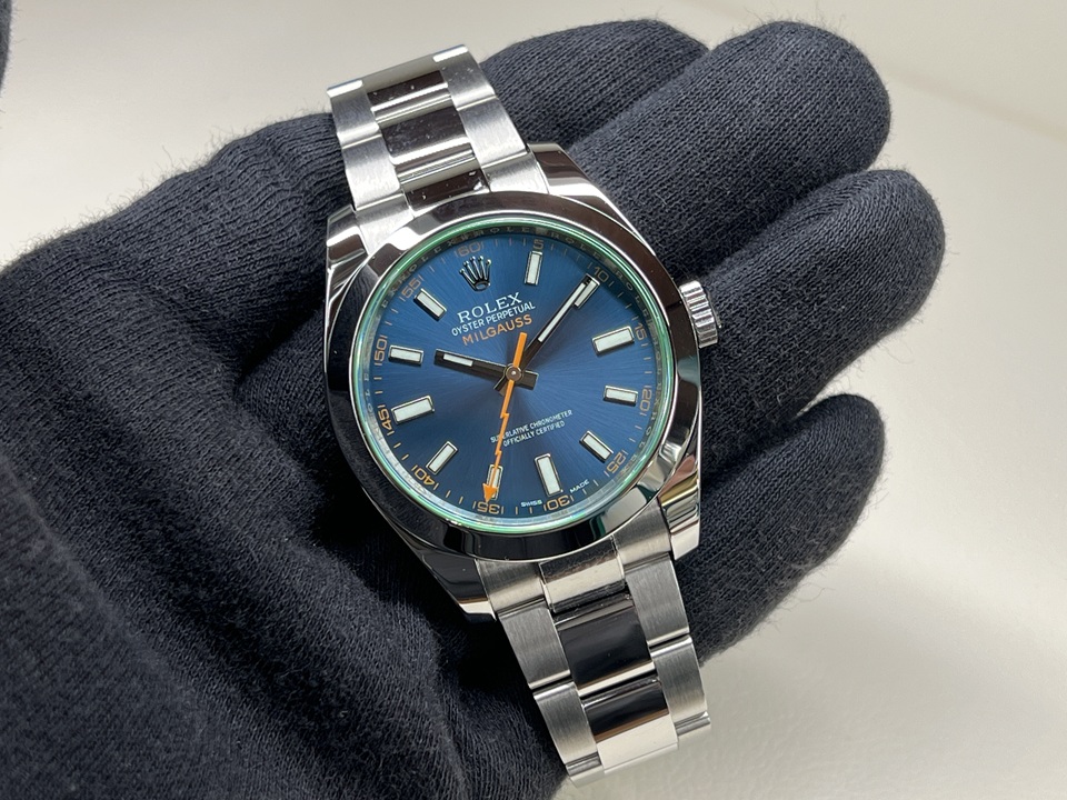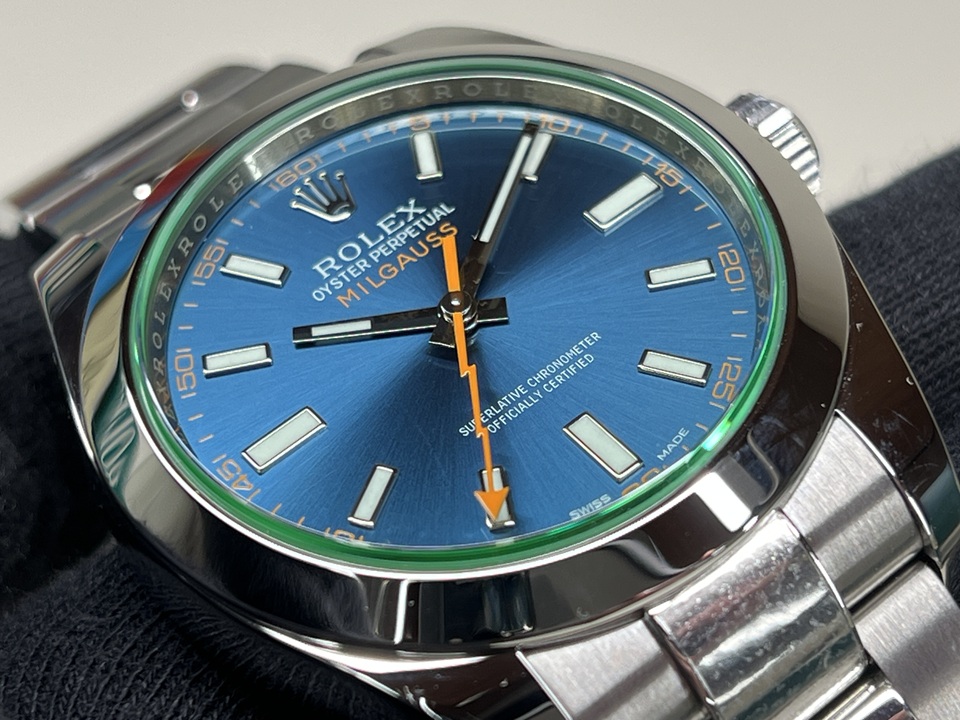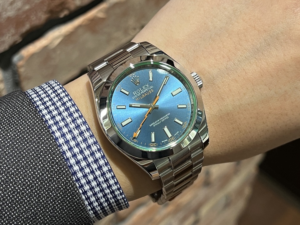 | 本日は“MILGAUSS”(Ref.116400GV)Zブルーダイヤルをご紹介。2023年に惜しくも生産終了となってしまったミルガウス。 そしてこちらの『Zブルーダイヤル』は2014年から追加されたダイヤルカラーとなり、今後の動向が気になる1本でもあります。 |