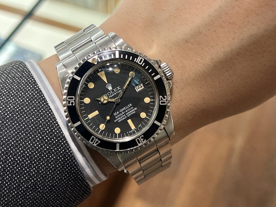 | 本日はヴィンテージロレックスの中からから“SEA-DWELLER”(Ref.1665)をご紹介。1967年にプロ仕様のダイバーズウォッチとして登場した第1世代のシードゥエラー。飽和潜水時に自動でヘリウムガスを排出する特殊機構「ヘリウムガスエスケープバルブ」が搭載されており、当時のサブマリーナーの3倍となる610m防水を可能としました。 |