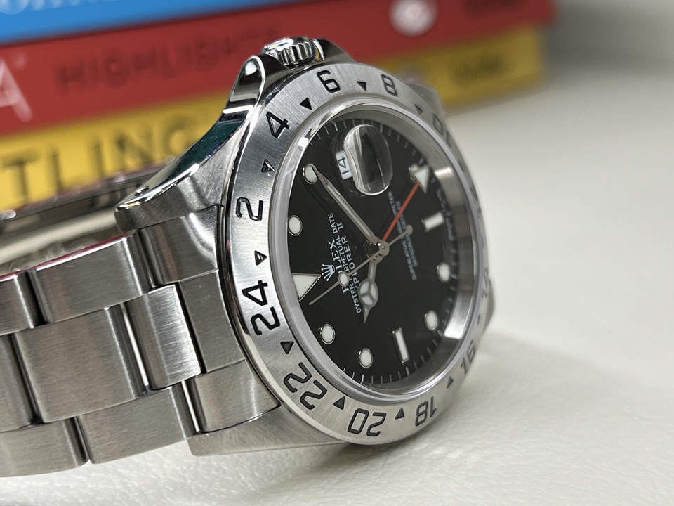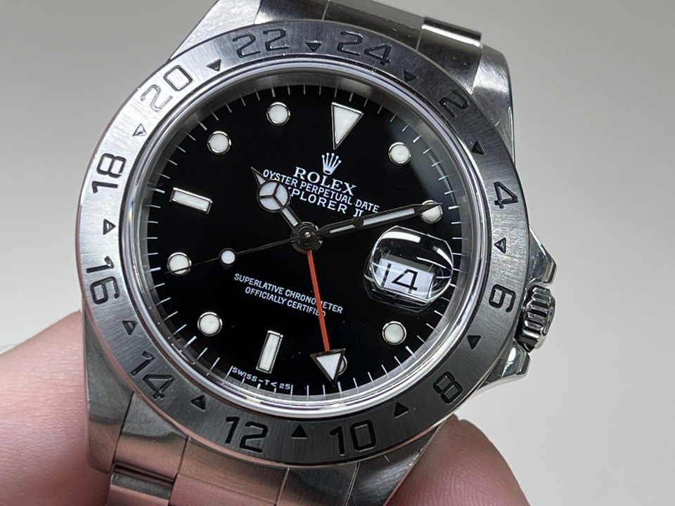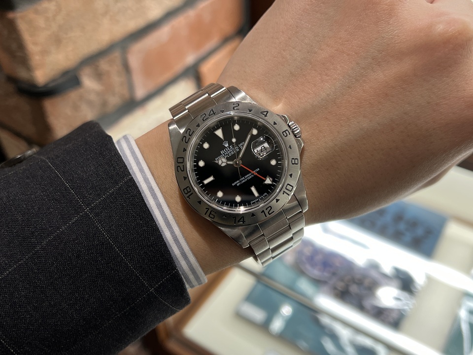 | 本日は“EXPLORER II”(Ref.16570)ブラックダイヤルをご紹介。約20年のロングセラーモデルで、腕馴染みのよいサイズ感,、ツールウォッチらしいデザインが多くの支持を集め、生産終了した現在でも人気が衰えないスポーツモデルでございます。 |
