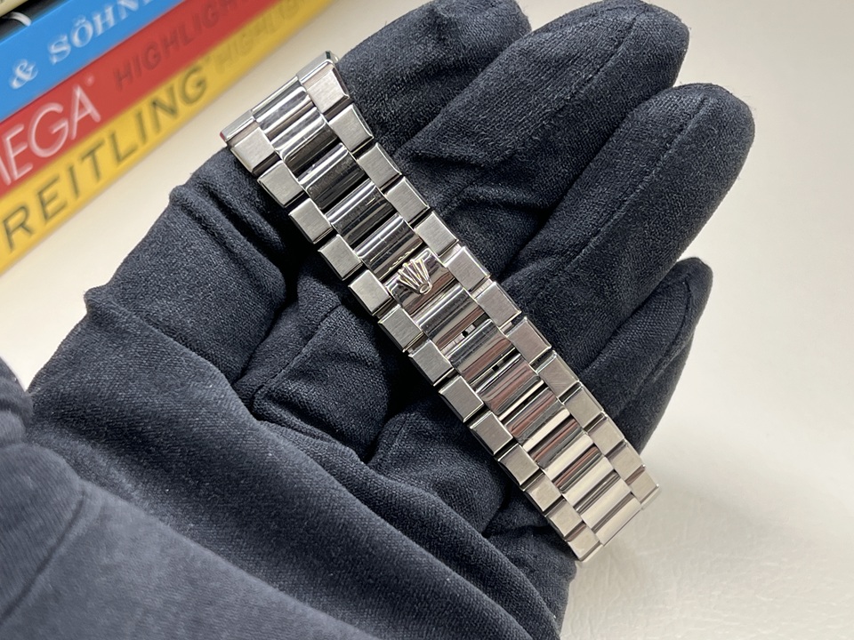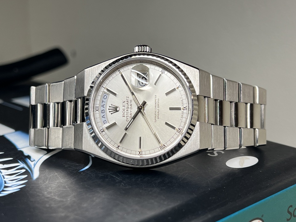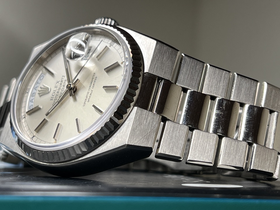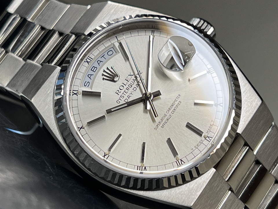 | 本日はヴィンテージロレックスの中から”DAY-DATE”(Ref.19019)シルバーダイヤルをご紹介。こちらの個体は、現在では珍しいクォーツ式のDAY-DATE。 WG製のブレスレット一体型ケースは、2025年新作モデル『LAND-DWELLER』の登場で再び注目を集めております。 |