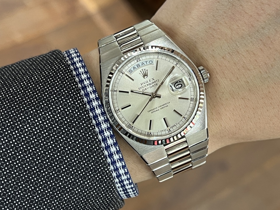 | 特徴的なデザインと、イタリア語表記の曜日表示が個性的な1本。クォーツ式特有のステップ運針は、どこか小気味よく癖になります。 入荷も少ない希少なヴィンテージロレックスでございます。まずはご試着からいかがでしょうか。 |